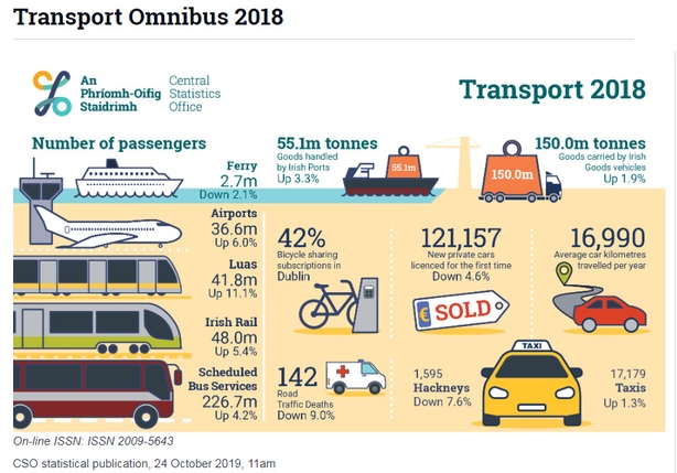 The figures are contained in the CSO's Transport Omnibus for 2018, which is a comprehensive picture of transport activity in Ireland.