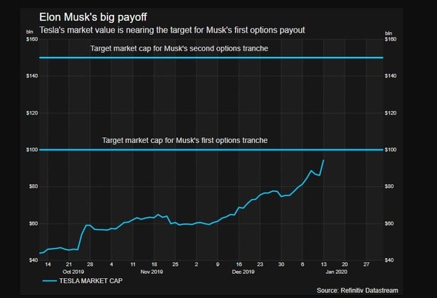 They need to rise another 6% to put Tesla's stock market value at $100 billion and then be sustained at that level for both a one-month and six-month average in order to trigger the vesting of the first of 12 tranches of options granted to Musk to buy Tesla stock.