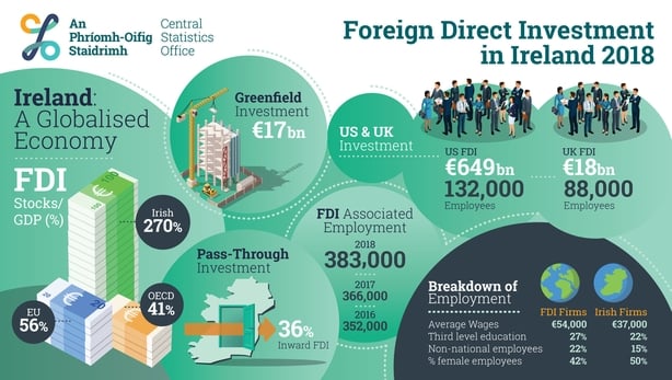 New figures from the Central Statistics Office show that Ireland's stock of FDI fell from €882 billion in 2017 to €874 billion in 2018. That is equal to 270% of GDP compared to an EU average of 56%.