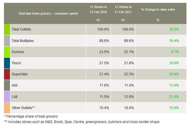 New figures from Kantar show that take-home grocery sales in Ireland grew by 16.3% in the 12 weeks to February 21.