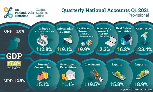 The economy grew strongly by 7.8% in GDP terms in the first three months of the year, according to the latest figures from Central Statistics Office.