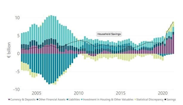 The figures show that household savings increased by €1.5bn in the first three months to stand at €7.4bn for the quarter.