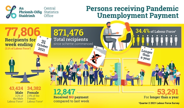 In the last week of October, the CSO said that 77,806 people were in receipt of the Pandemic Unemployment Payment (PUP), down 23,663 from the previous month and 267,899 from a year ago.