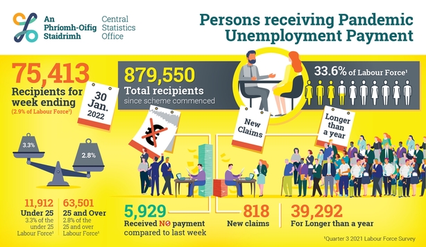 There was a 3.3% increase in the combined number of people on the Live Register or receiving the Pandemic Unemployment Payment (PUP) in January, according to the Central Statistics Office.