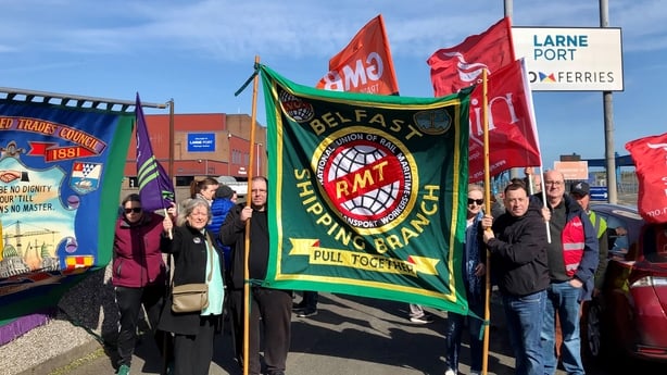 Several seafarers from rival operator Stena Line, which sails out of Belfast, joined the sacked P&O workers in Larne to show solidarity with them today.
