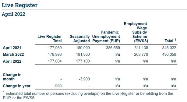 New figures from the Central Statistics Office show that the seasonally adjusted Live Register total for April stood at 177,100, down 3,900 from March.