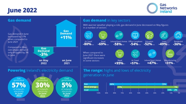 The figures show that gas generated 57% of Ireland's electricity demand in last month, up three percentage points on both the previous month and compared to June last year.