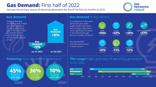 Gas generated 45% of Ireland's electricity in the first six months of this year, as it did for the same period in 2021.
