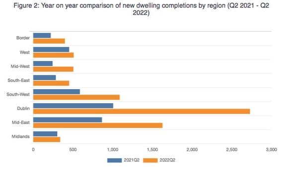 Seven of the eight regions of Ireland - all except the South-East - recorded an increase in completions in the second quarter of the year, compared to the same time last year.