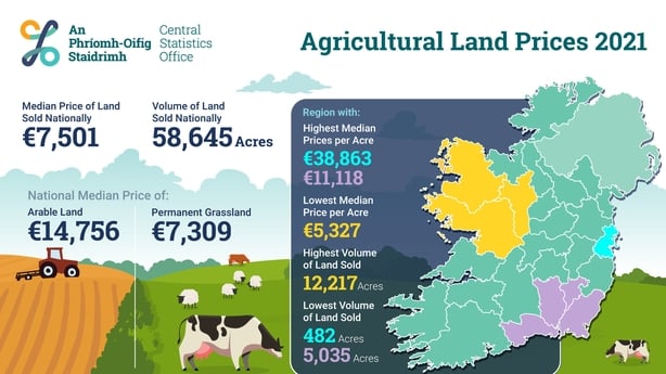 New figures from the Central Statistics Office show that the median price per acre of farmland stood at €7,501 in 2021, 7.4% higher than in 2020, when it was €6,987.