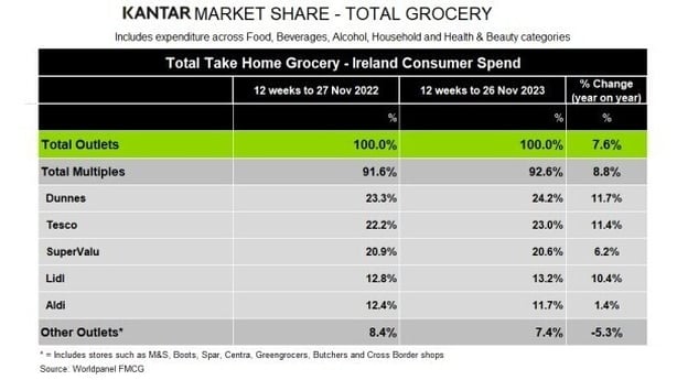 Today's figures show that Dunnes, Tesco and Lidl all grew ahead of the total market in terms of value this month.