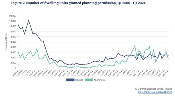 Houses accounted for 58% of all dwelling units granted planning permission, while apartments made up the remaining 42%.