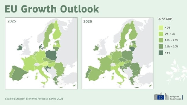 Overall the EU economy began 2025 on a stronger footing than anticipated and is projected to grow at a modest rate this year, with growth expected to pick up in 2026, "despite heightened global policy uncertainty and trade tensions", the Commission said.
