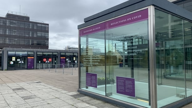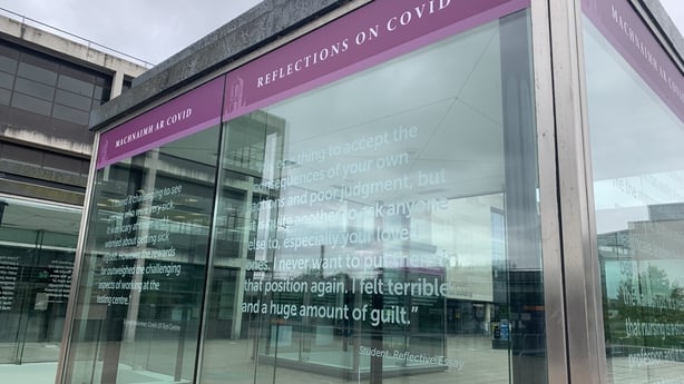 Signage accompanying the display reads: "Some of the more hard-hitting thoughts come from among the small number of students who were asked to reflect after breaking Covid rules. The quotes come from essays they wrote after watching the RTÉ Investigates documentary Covid-19: The Third Wave".