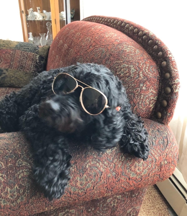 Morris the black Cockapoo is snoring comfortably on a red sofa in New York.