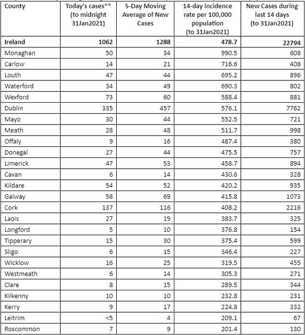 The counties with the highest rate of infection are Monaghan (990.5), Carlow (716.6) and Louth (695.2).