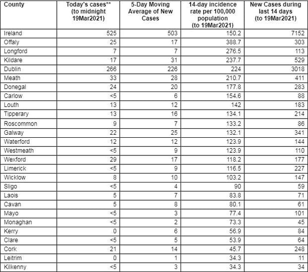Geographically, 266 of the new cases are in Dublin, with 33 in Meath, 29 in Wexford, 25 in Offaly and 24 in Donegal. The remaining 148 cases are spread across 19 other counties.