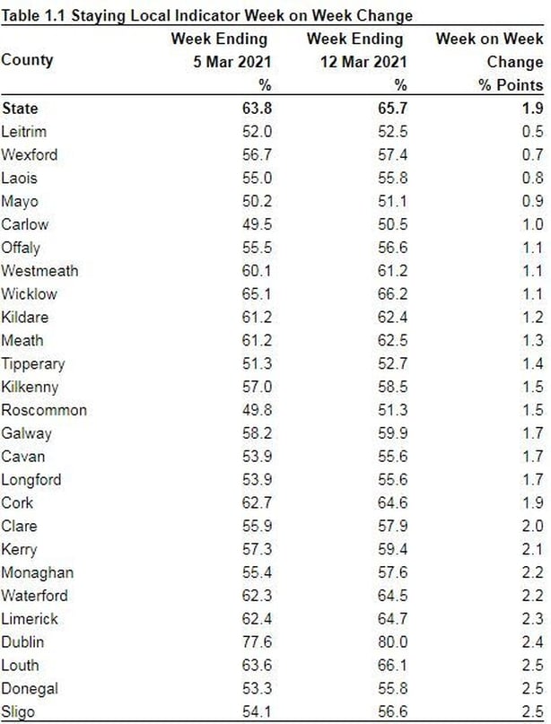 Meanwhile, the majority of the population stayed local, within 10km of home, during the week ending 12 March, according to the Central Statistics Office.