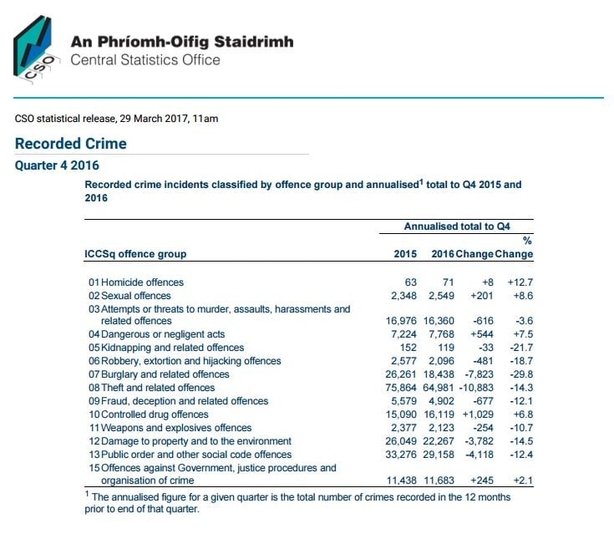 The CSO resumed publishing recorded crime statistics in June 2015, following a comprehensive review of the accuracy of crime data from An Garda Síochána.