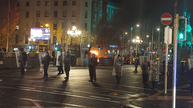 We, along with many other people, got inadvertently caught up in this. We were pushed back down Burgh Quay by the Garda Public Order Unit, away from the junction at the bridge.