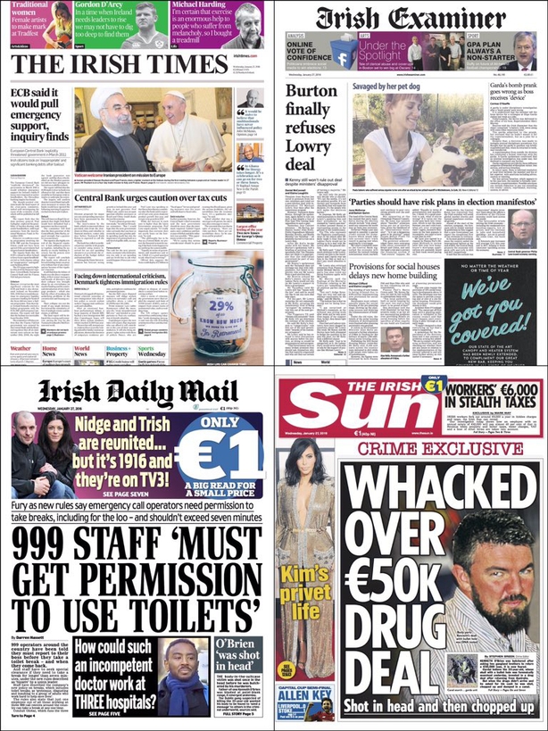 Today's papers at a glance Updated / Wednesday, 27 Jan 2016 09:16 Central Bank warning over tax cuts, Michael Lowry, election manifestoes and social houses are some of the topics dominating today's front pages.