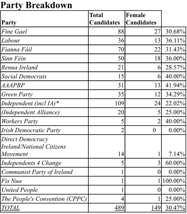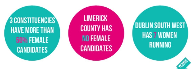 So far 149 of the 489 candidates are women. While three constituencies have more than 50% women running, the Limerick County constituency currently has no female candidates.
