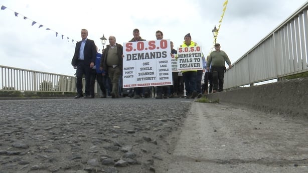 Up to 200 people have gathered on a bridge over the River Shannon in Banagher in Co Offaly to highlight the concerns of farmers and residents along the river about rising summer water levels.