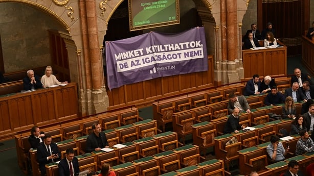 "When we chained ourselves up during the constitution's first overhaul in 2011, we never thought that 14 years later, we would have to do the same thing," said opposition lawmaker Timea Szabo.