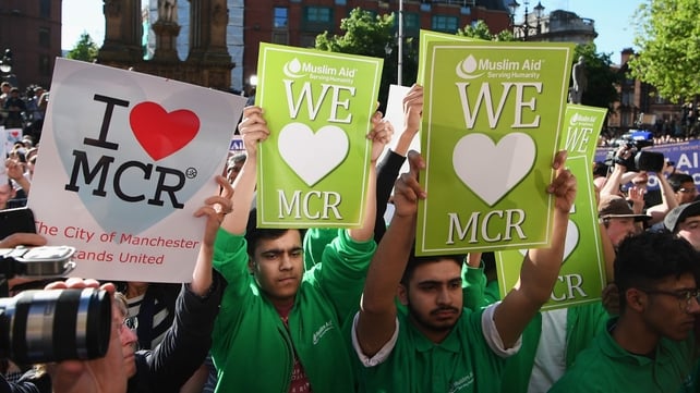 Police forensic investigators walk along a bridge linking Victoria Station with the Manchester Arena where the suspected terrorist attack at the end of a concert by US star Ariana Grande left 22 deadEmergency services at Manchester Arena after the explosion at the venueGreater Manchester Police chief constable Ian Hopkins speaks to the media where he said that the death toll from the Manchester bomb attack had risen to 22 with 59 injuredA young girl wearing a t-shirt of US singer Ariana Grande stands with women talking to police near Manchester ArenaPeople affected by the deadly terror attack look out from a hotel window in ManchesterThe first floral tributes to the victims of the terrorist attack are placed on the empty streets of Shudehill this morningPrime Minister Theresa May signs a book of condolence for the victims of the attack