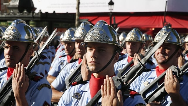 Members of the military walk past dignitaries, including US President Donald TrumpFrench jets perform a fly overUS President Donald Trump and French leader Emmanuel MacronThe parade makes its way along the Champs-ElyseesSecurity is tight around FranceMelania and Donald Trump view the paradeFrench President Emmanuel MacronFrench firefighters prepare for the paradePioneers of the French Foreign Legion prepare to take part in the parade