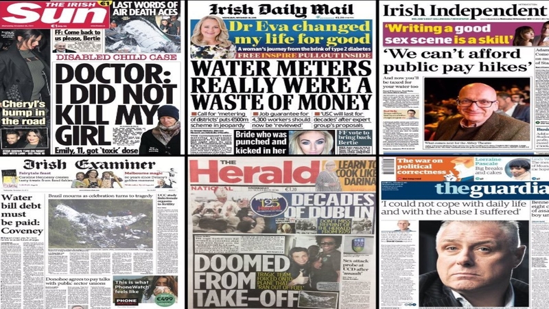 The Irish Daily Star and Herald runs with the one-word lead headline "Doomed" while The Herald runs with "Doomed from take-off". The Irish Times and Examiner also run with front page pictures of the crash scene. "Brazil mourns as celebration turns to tragedy" is the headline in The Examiner.