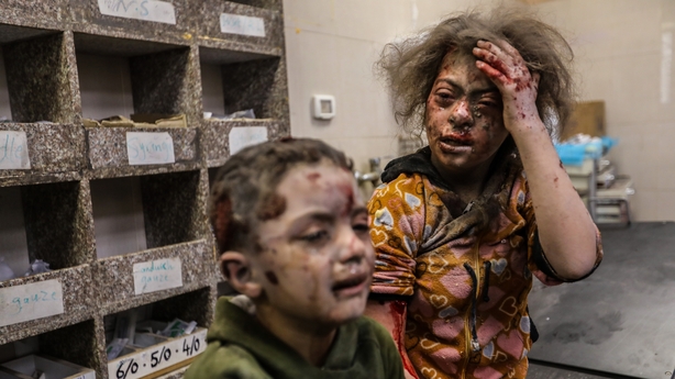 Footage obtained by Reuters showed a boy covered in grey dust, sitting weeping amid crumbled cement and rubble from collapsed buildings.