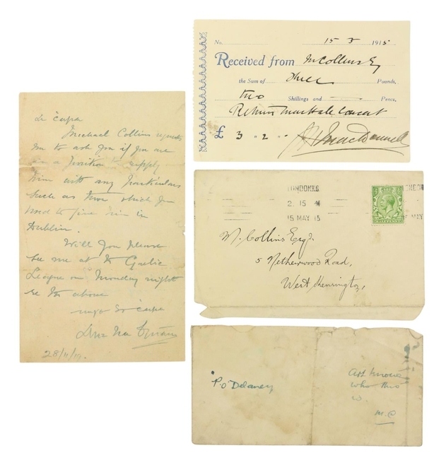 A guide price of €2,000 to €3,000 is in place for Lot 582, which involves a collection of cryptic letters and notes written by Collins in London prior to The Treaty. The collection includes an envelope addressed in Collins’ hand to P O’Delaney, with a note signed MC saying, 'Art knows who this is.’