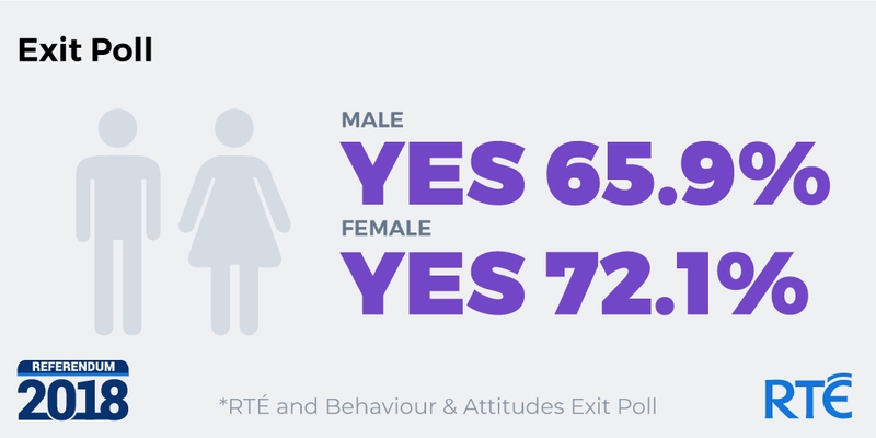 72% of women and 65% of men voted for repeal of the Eighth Amendment, the exit poll suggested.