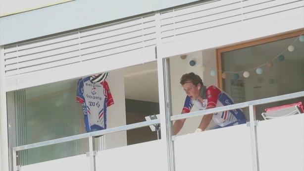 It is a quiet spring evening at a typical Swiss housing complex in the village of Tafers and on the balcony of a second floor apartment block, professional cyclist Kilian Frankiny is competing in the Tour de Suisse.