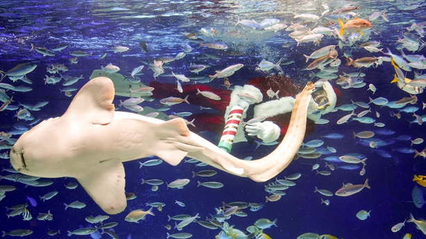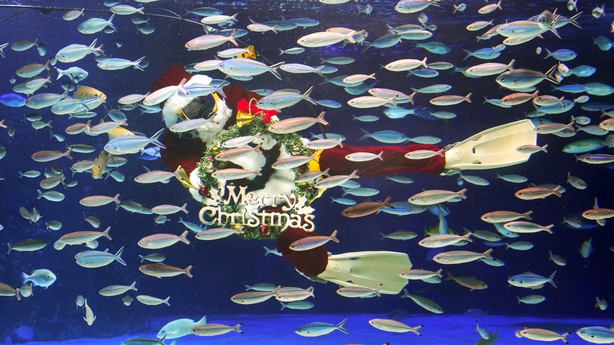 Dressed in a Santa Claus costume, mask and flippers, a diver waved through a curtain of tropical fish while socially distanced spectators watched from behind glass.