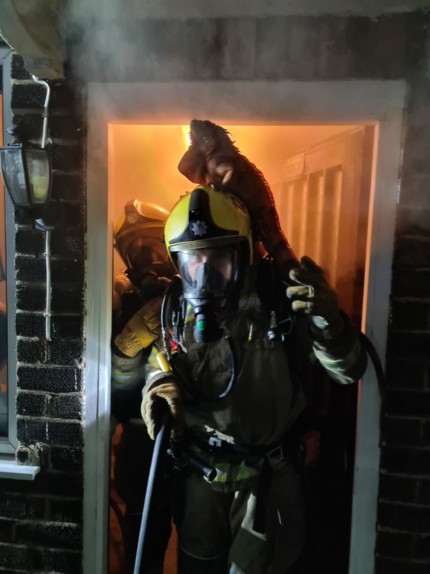 An iguana mounted a daring escape on top of a firefighter's helmet during a fire at a house in England.