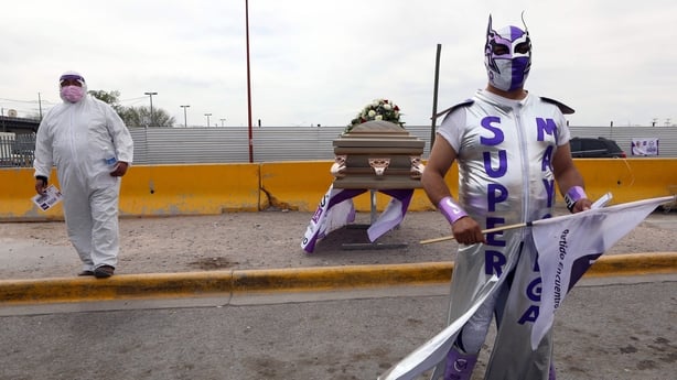 He was accompanied by aides dressed in personal protective equipment and carrying bouquets of flowers to draw attention to Mexico's Covid-19 death toll of more than 200,000 - one of the world's highest.