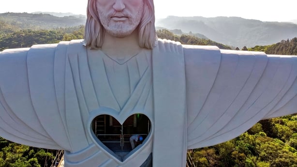 The statue has an observation point for visitors who can look out through a large heart-shaped window.