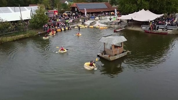 To win the regatta, teams of four had to be first to race round a hut in the middle of the pond in the northern town of Kasterlee, before driving their paddles into a hollowed-out pumpkin on the opposing shore.