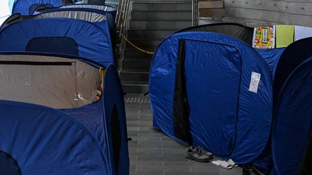 Makeshift tents were being set up at a city hall where around 270 people were taking shelter, with bottles of water and food supplies spread out on tables.