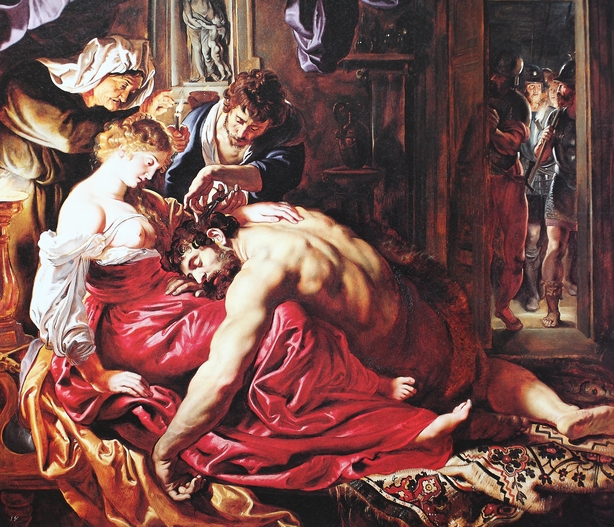 Based on the Old Testament story of the Israelite hero Samson, the painting depicts the moment an accomplice of his treacherous lover Delilah cuts off his hair, the source of his warrior power.