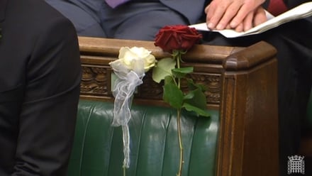 Leagadh rós bán agus rós dearg ar an suíochán bá gháth do Jo Cox suí ann sa Teach.