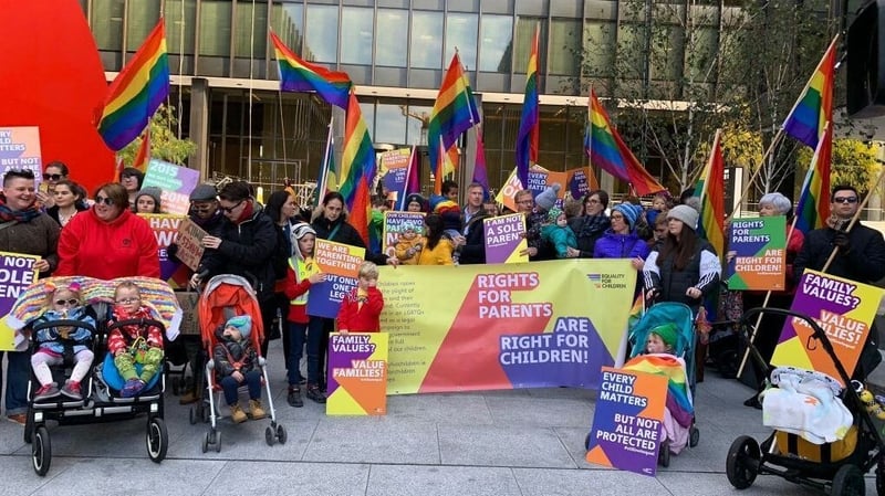 Léirsigh tuismitheoirí comhghnéis taobh amuigh den Roinn Sláinte i mBaile Átha Cliath inniu lena míshástacht a chur in iúl faoin moill ar reachtaíocht nua maidir le cearta tuismitheoireachta.