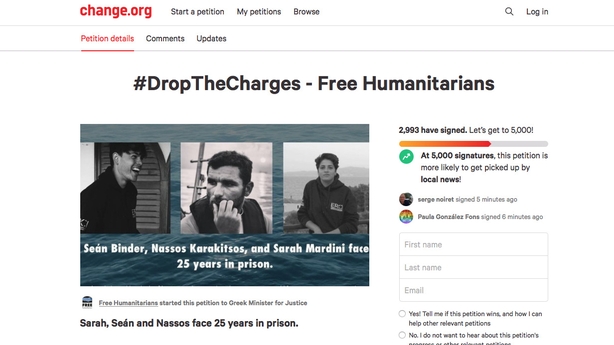I gCorca Dhuibhne a tógadh Seán Binder, mar a bhfuil gaolta agus cairde i mbun feachtais anois agus iad ag iarraidh aird a tharrac ar an gcás. Tá suas le 3,000 ainm curtha le hachainí agus é le seoladh fé bhráid rialtas na Gréige. Tá tacaíocht léirithe ag eagraíochtaí cearta daonna don dtriúr agus éilimh déanta ag leithéidí Amnesty International, Irish Refugee Council agus Free Humanitarians.org na cúiseanna a chur ar ceal.