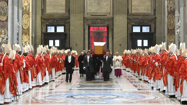 Is é a chomharba an Pápa Proinsias II a léigh an tAifreann agus cónra lom cufróige Bheinidict os a chomhair amach.
