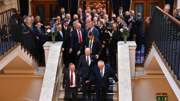 Sular thug an tUachtarán Biden a óráid i dTeach Laighean, labhair sé ar feadh cúpla nóiméad le ceannairí na bpáirtithe agus na ngrúpaí éagsúla polaitíochta san Oireachtas.