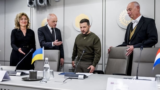 Tá Uachtarán na hÚcráine Volodymyr Zelensky sa Háig inniu, mar a bhfuil comhráite ar bun aige le ceannairí na Cúirte Coiriúla Idirnáisiúnta.