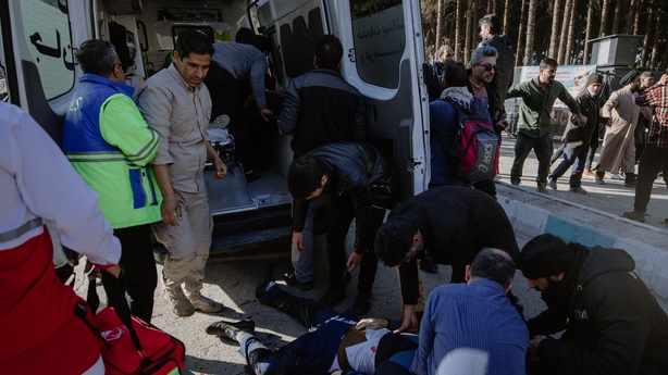 Gar d'uaigh an Ghinearáil Qasem Soleimani a phléasc na buamaí agus searmanas ina chuimhne ar siúl.