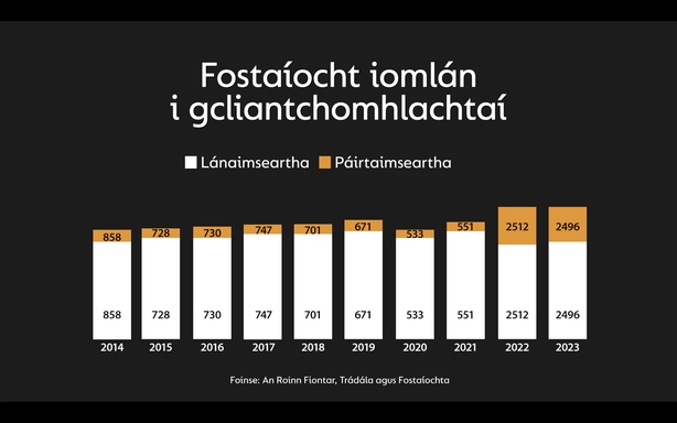 Fágann sin ar fad go raibh laghdú de 779 post lánaimseartha agus méadú de 1,945 post páirtaimseartha ann idir 2021 agus 2023.